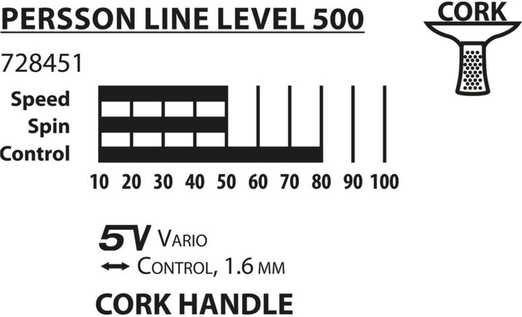 Met de Persson 500 houd je volledige controle over de bal. Dit wordt mogelijk gemaakt door de 1,6 mm dikke spons tussen het hout en het SCHILDKRÖT Elite rubber. Het kurken handvat absorbeert zweet om ook in gespannen situaties een goede grip te garanderen.