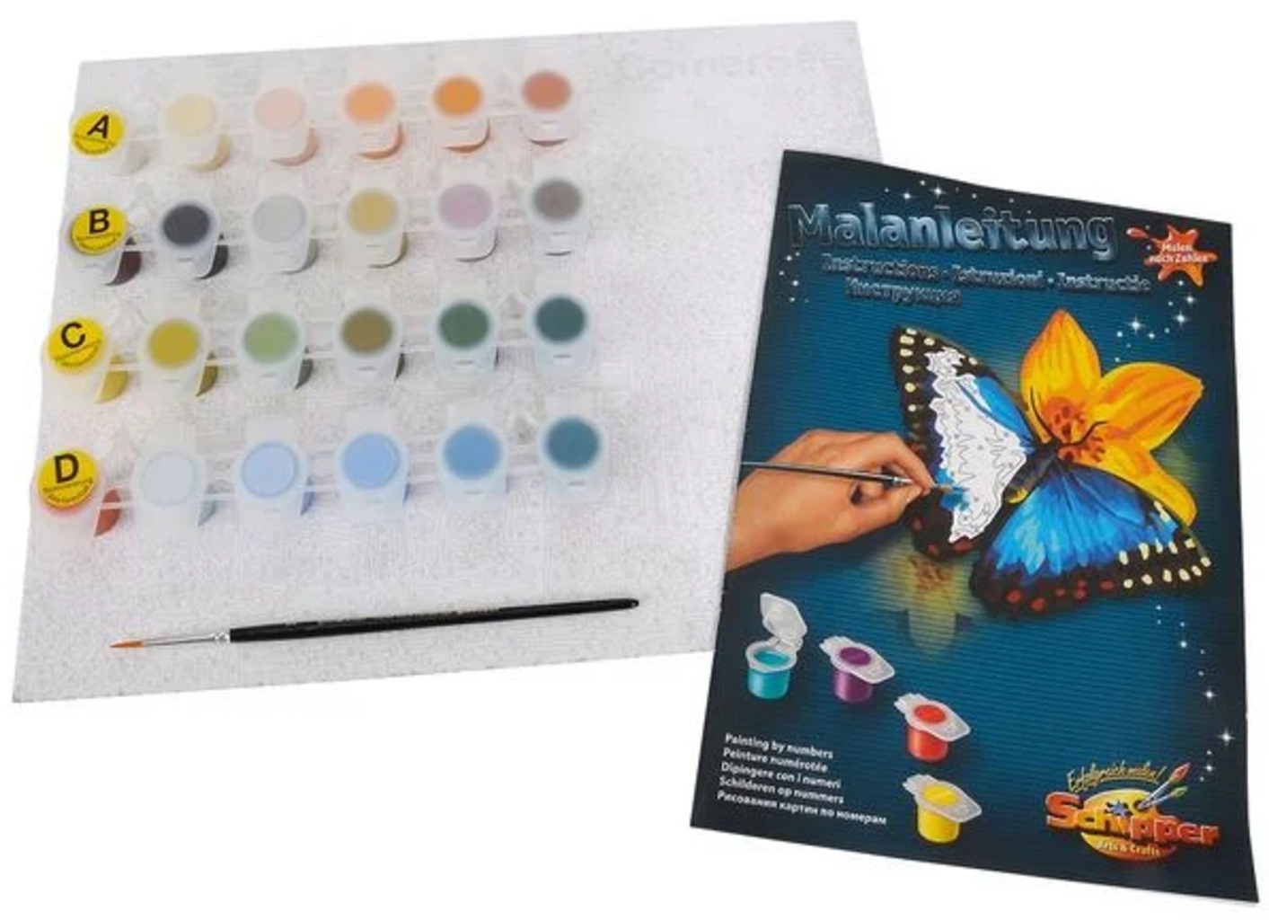 Inhoud: schilderkarton met linnenstructuur, acrylverf, fijn penseel, controleblad en een uitgebreide handleiding in het Duits