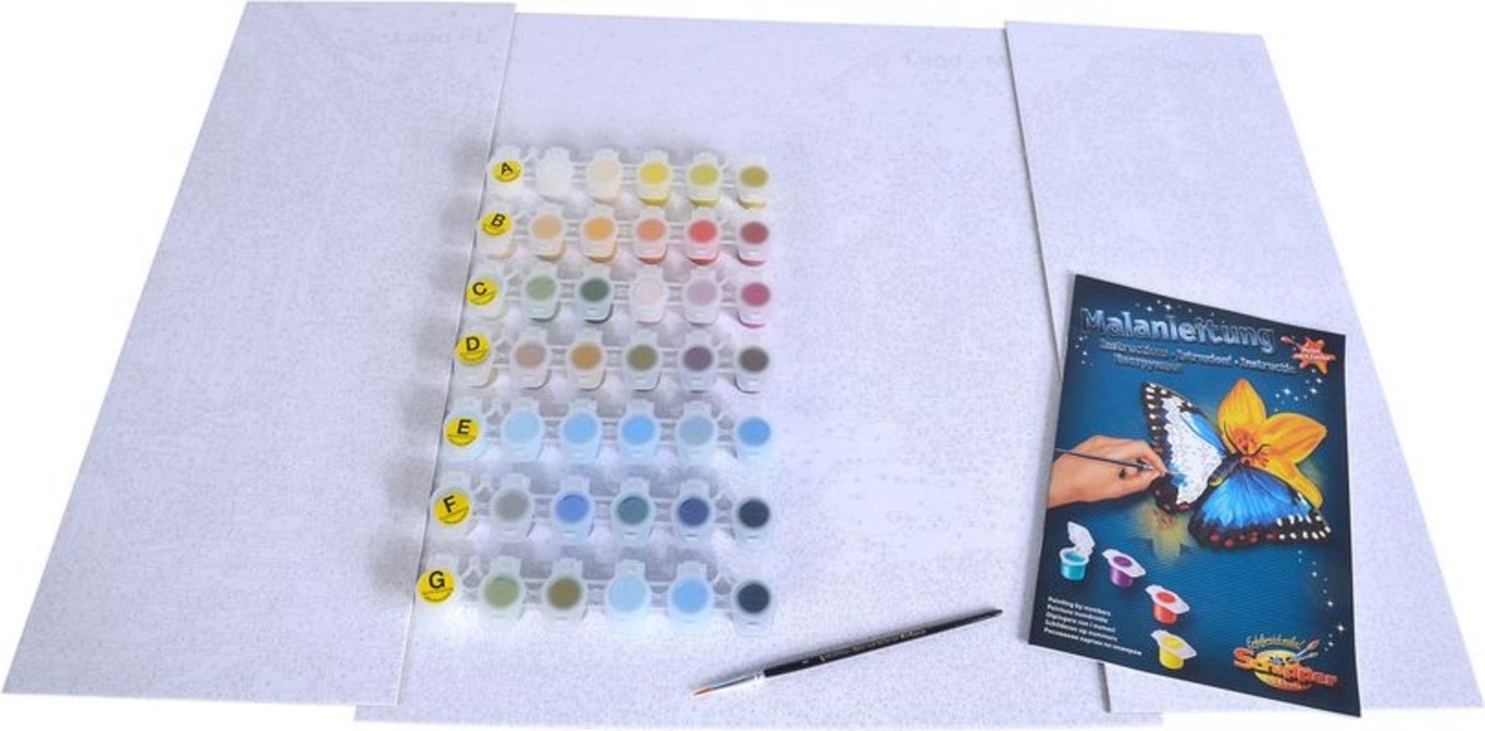 Inhoud: 3 schilderkartons met linnenstructuur en contourtekeningen, acrylverf op waterbasis, penseel, handleiding, controleblad