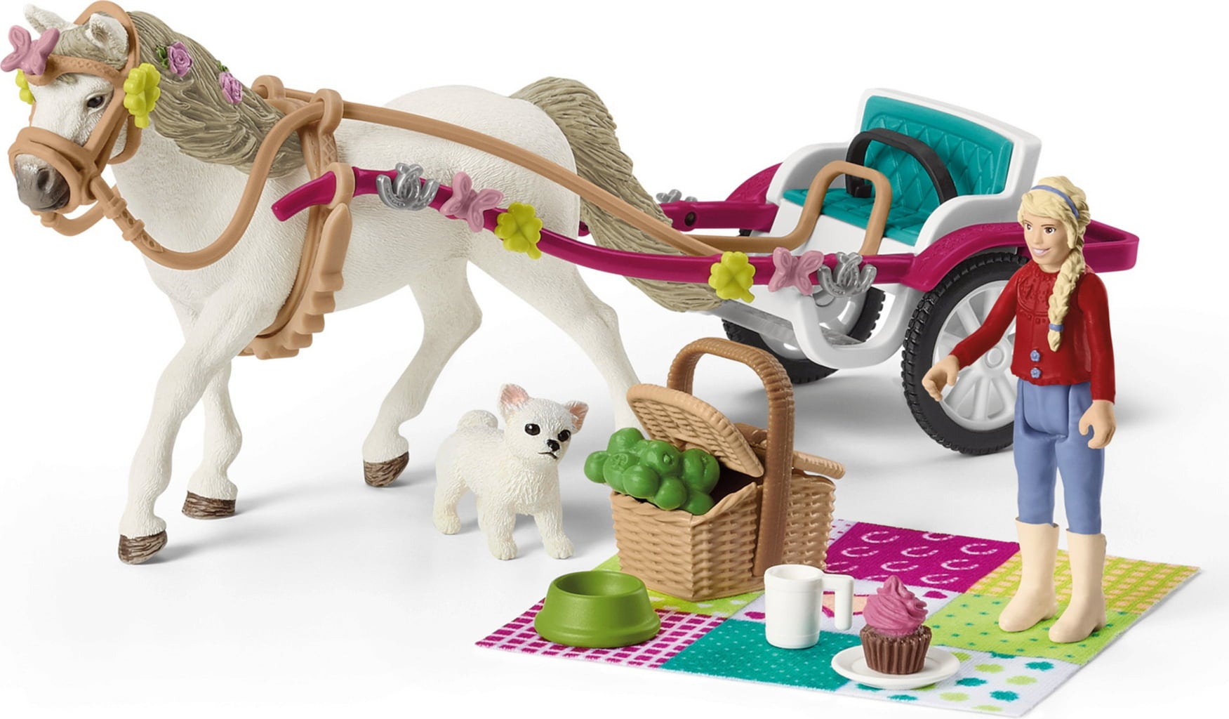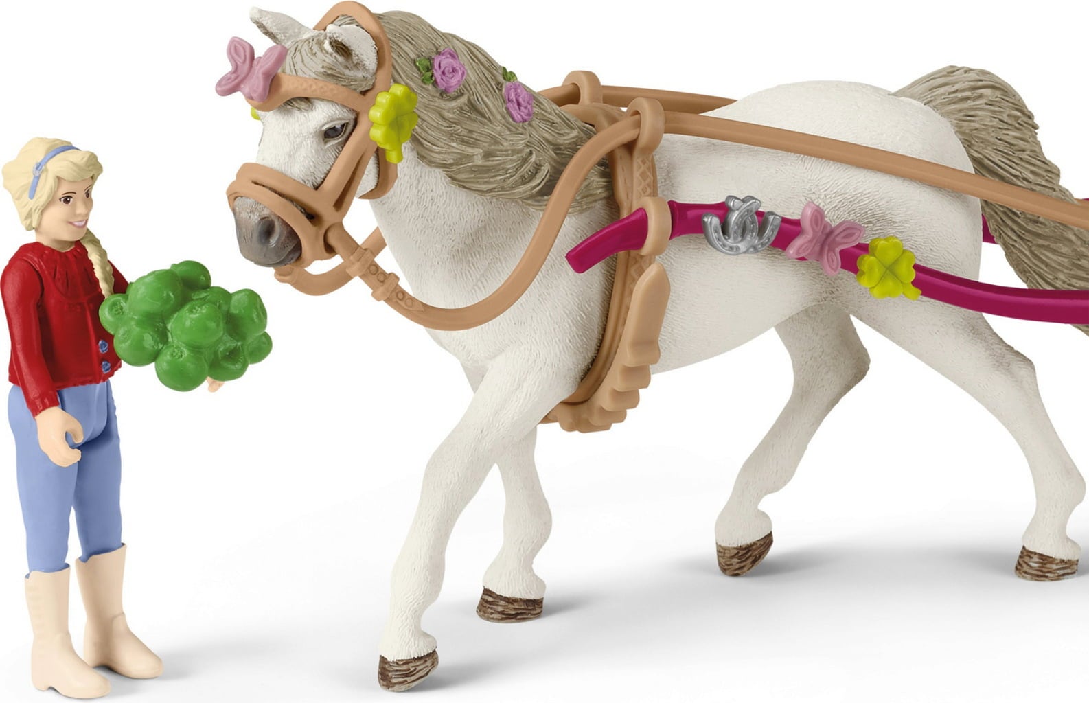 Clara en haar pony hebben zich verkleed voor de grote paardenshow. De koets is versierd met fijne decoratieve elementen en de manen van de pony zijn versierd met vlinders en klavers. Clara gaat op de kleurrijke picknickdeken zitten en geniet van een kleine snack terwijl de pony knabbelt aan een heerlijke appel.