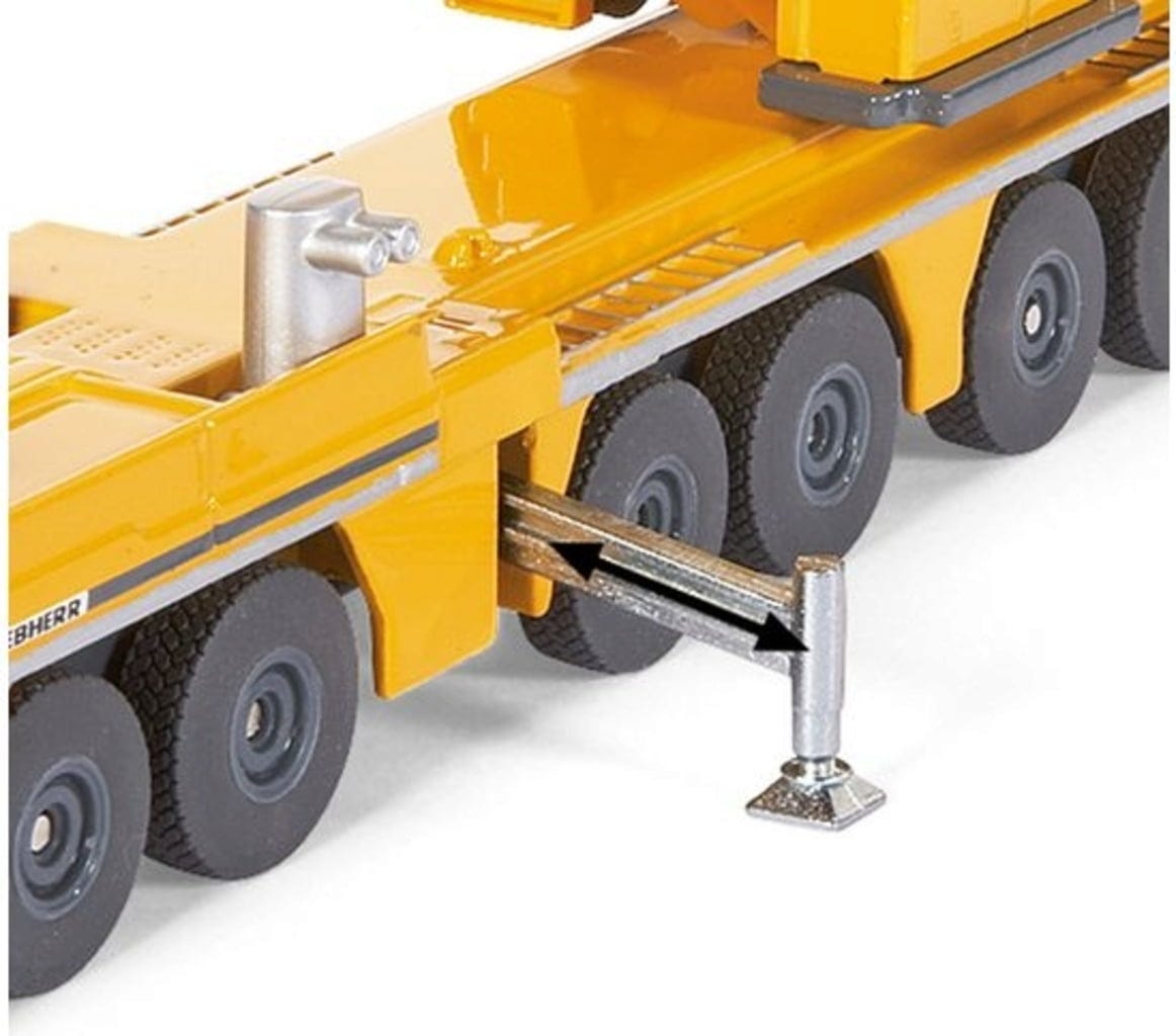 Altijd op de juiste plek. De Liebherr mobiele kraan beweegt zich op zeven assen over tapijt en parket. De banden zijn gemaakt van gerubberd materiaal. De bovenbouw en kraanarm zijn volledig beweegbaar. De vier metalen steunen kunnen worden uitgeschoven en zorgen voor een stabiele stand.