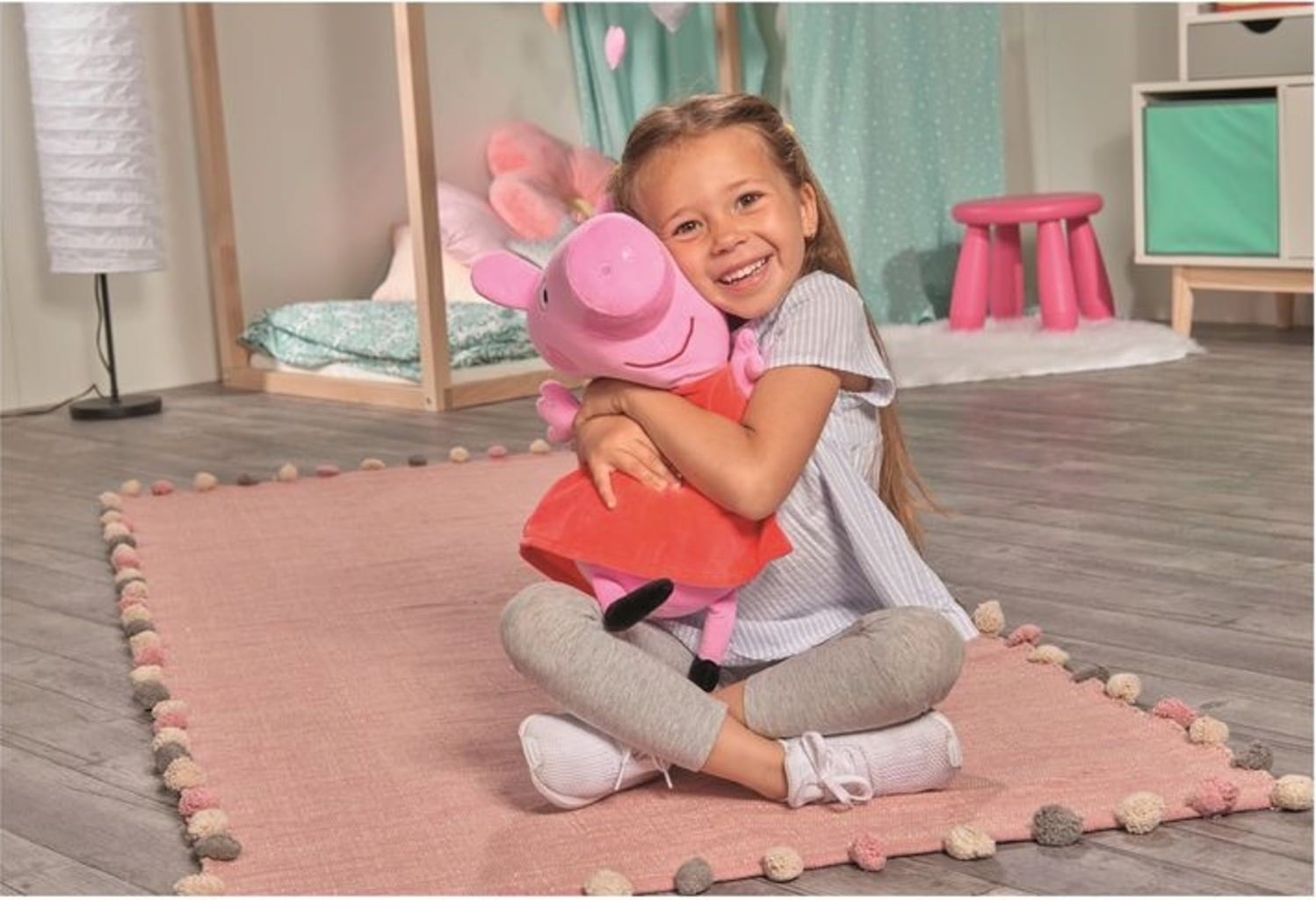 De avontuurlijke Peppa Pig uit de gelijknamige kinderserie wil heel graag geknuffeld worden! Gemaakt van superzacht pluche en met haar kenmerkende rode jurkje vergezelt het nieuwsgierige varkensmeisje je overal. De trouwe metgezel is 33 cm lang en blijft altijd bij je.