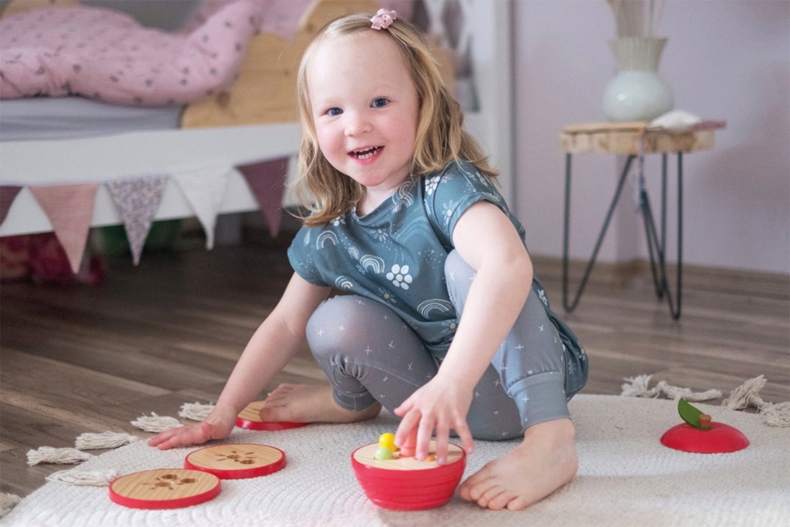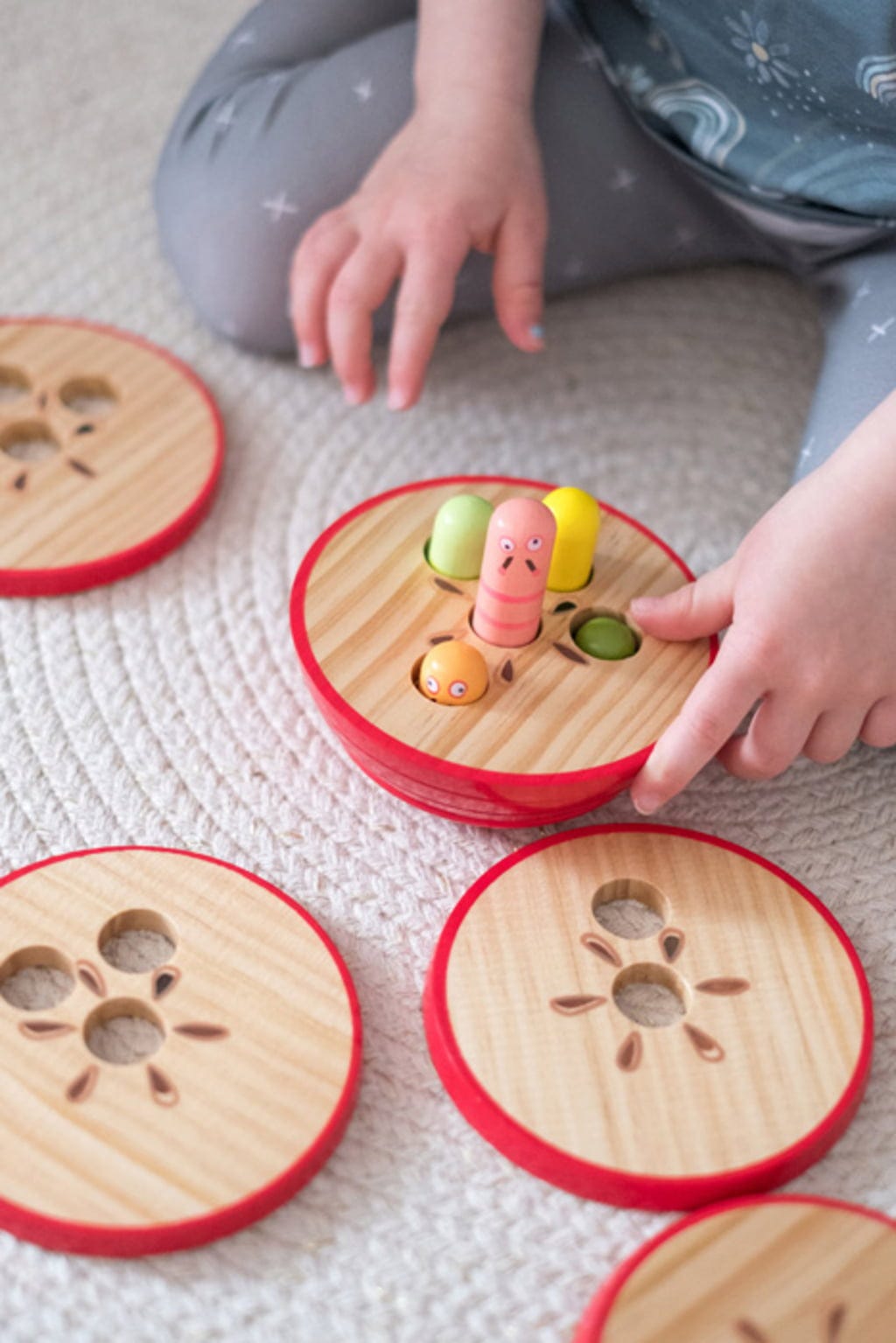 Dit leuke stapelspel nodigt kleine ontdekkingsreizigers uit om de afzonderlijke ringen te sorteren. Maar pas op: De appelschijfjes hebben een verschillend aantal openingen, dus moeten ze in de juiste volgorde op de rupsen van verschillende lengte worden gelegd. Een donkergekleurd klokhuis van de appel geeft echter een indicatie van hoe de schijfjes op de juiste manier bij elkaar moeten worden gelegd.