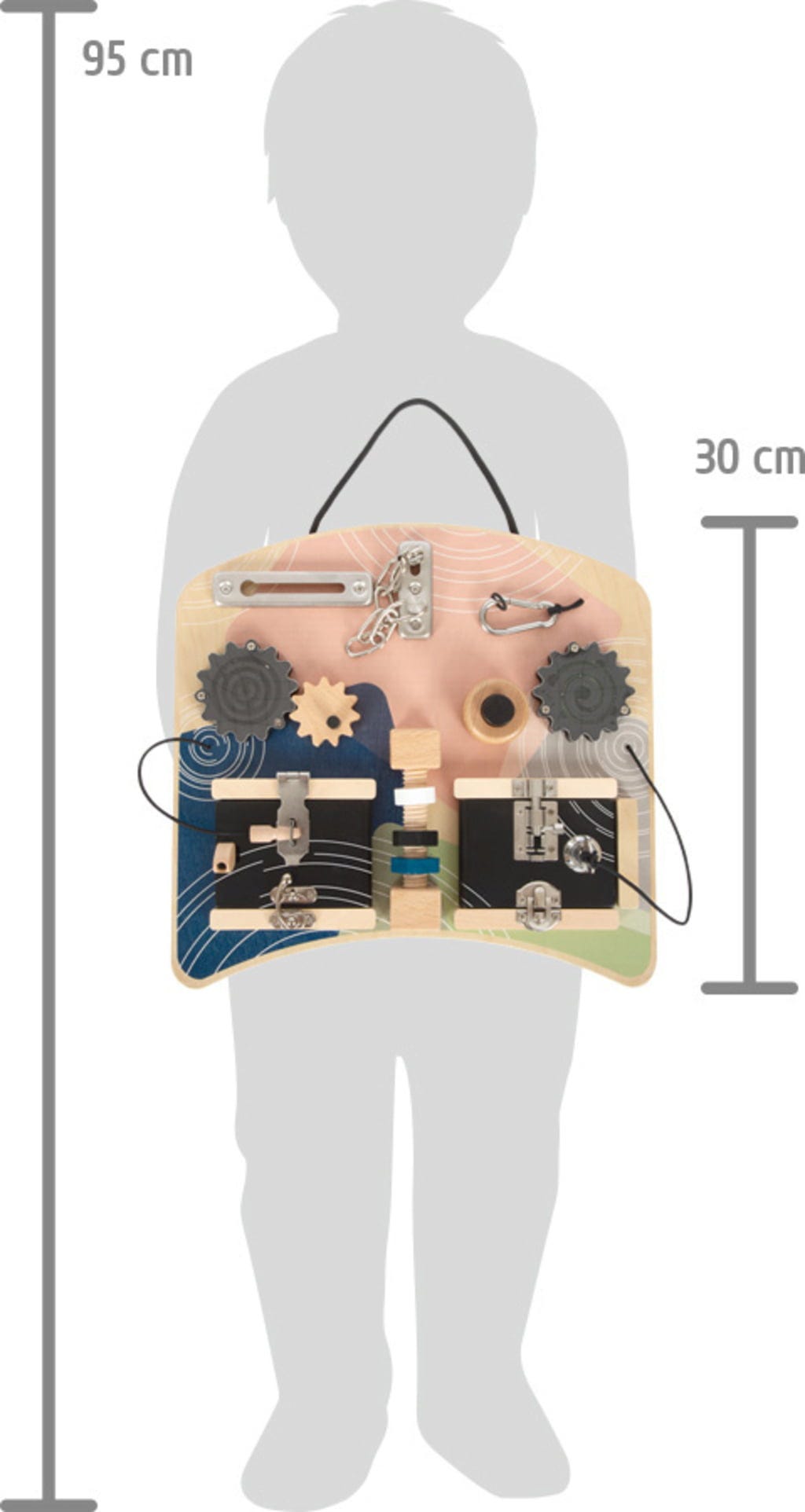 Op dit motoriekbord valt ontzettend veel te ontdekken. Verschillende sloten, twee tandwielspellen, een draadeind met moeren en een toeter wachten op nieuwsgierige kinderen. Tijdens het uitproberen trainen ze spelenderwijs hun behendigheid en oog-handcoördinatie.
