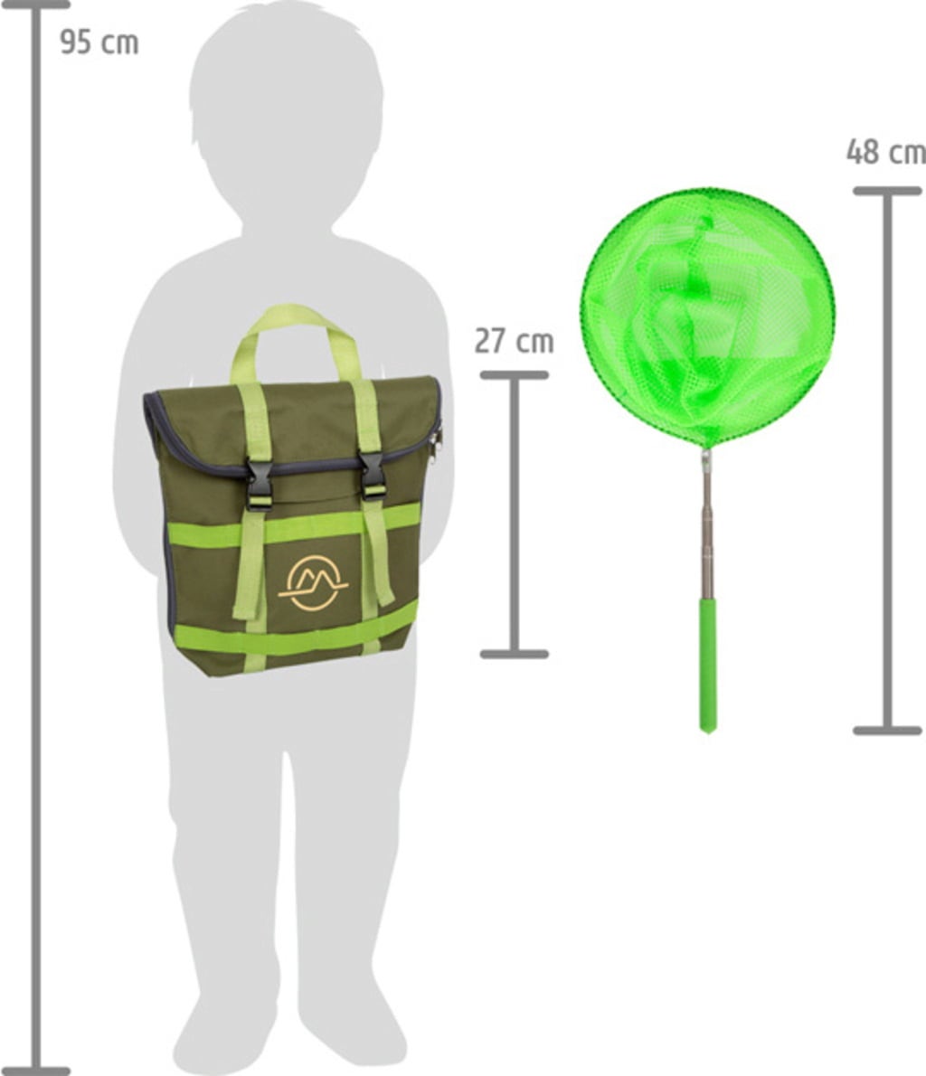 Inhoud: rugzak, telescopisch schepnet, grote loep met schroefdop, houten verrekijker, kompas, vergrootglas, pincet, kleine schep, karabijnhaak