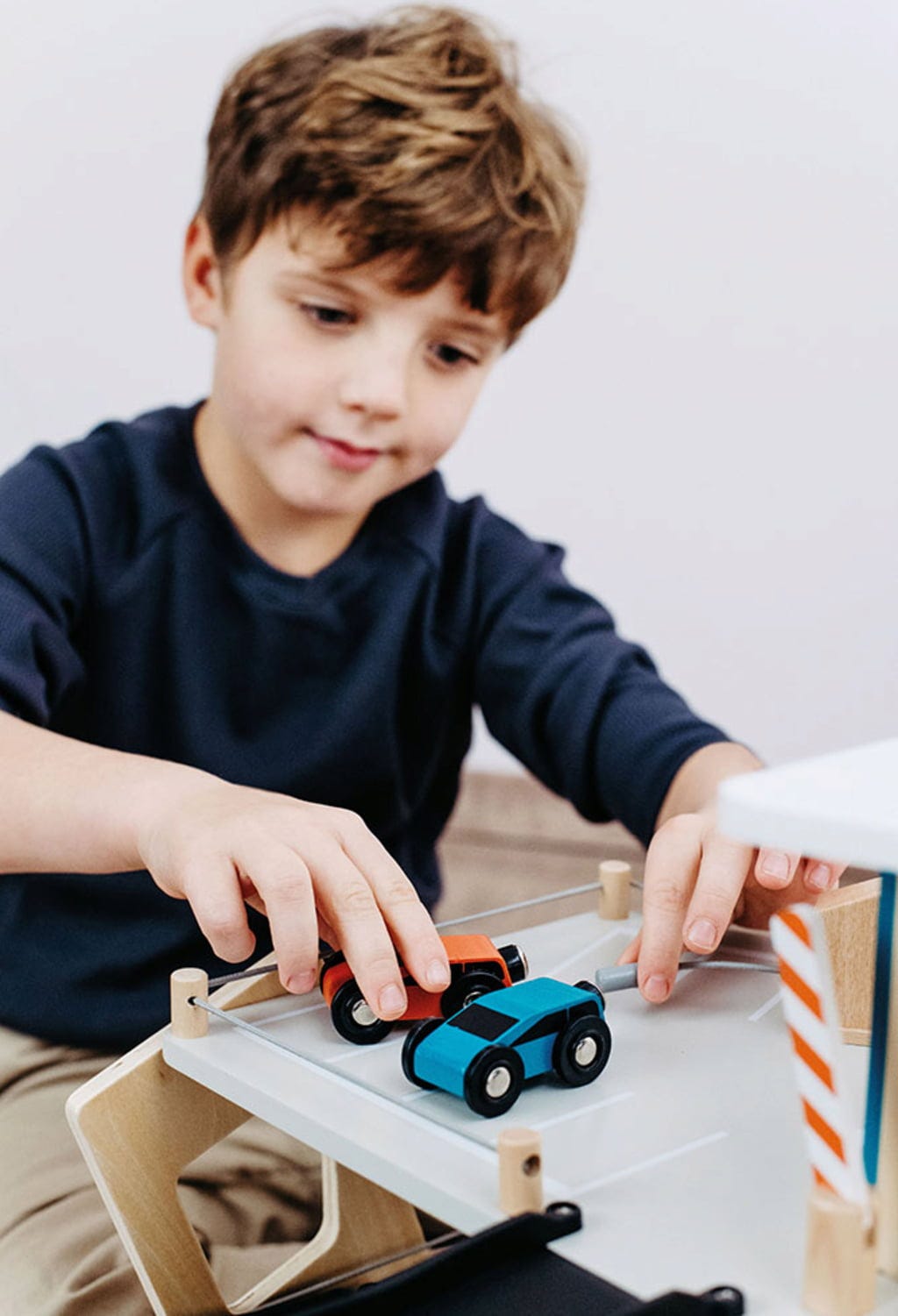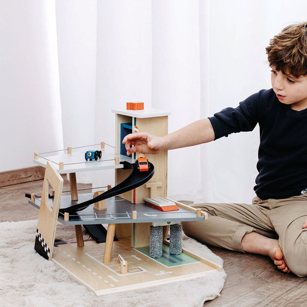 De Parkeergarage Rallye biedt urenlang rijplezier voor kleine autoliefhebbers. Met de bijbehorende hellingen, slagbomen, een werkplaats en een helikopterplatform kunnen kinderen creatief en fantasierijk spelen. De open bouwwijze en robuuste materialen zorgen voor veilig speelplezier, waarbij de voertuigen van boven naar beneden kunnen doorrijden – ideaal voor spannende scenario's in de kinderkamer.