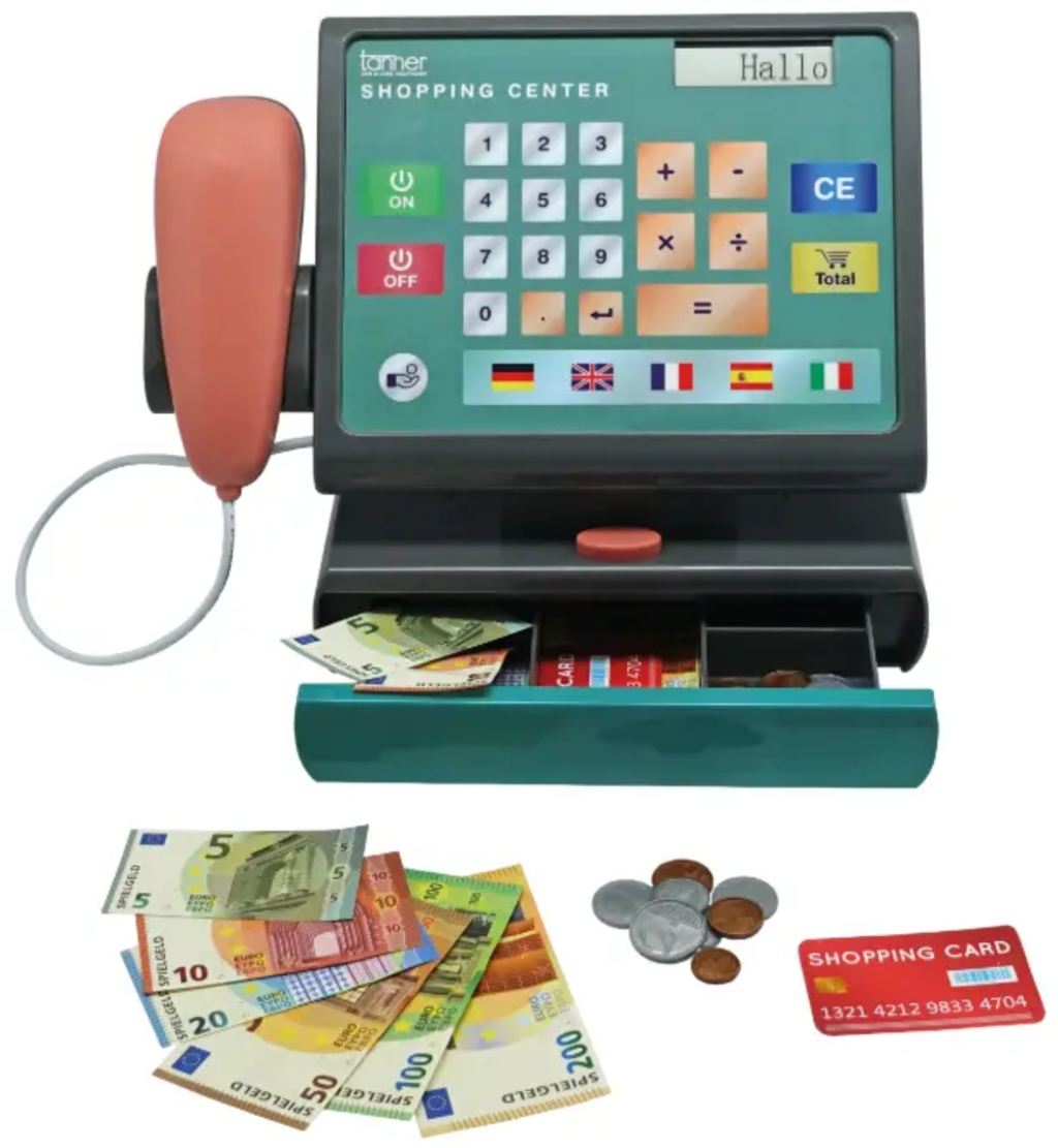 Net als in een echte supermarkt registreert deze kassa de prijzen en rekent ze bij elkaar uit. Met de scanner lees je de blauwe barcode van een van de gemarkeerde TANNER miniatuurproducten in. De kassa noemt direct de betreffende naam in een van de vijf talen en telt de prijs erbij op. Tot slot kan er worden betaald met contant geld of de shopping card.