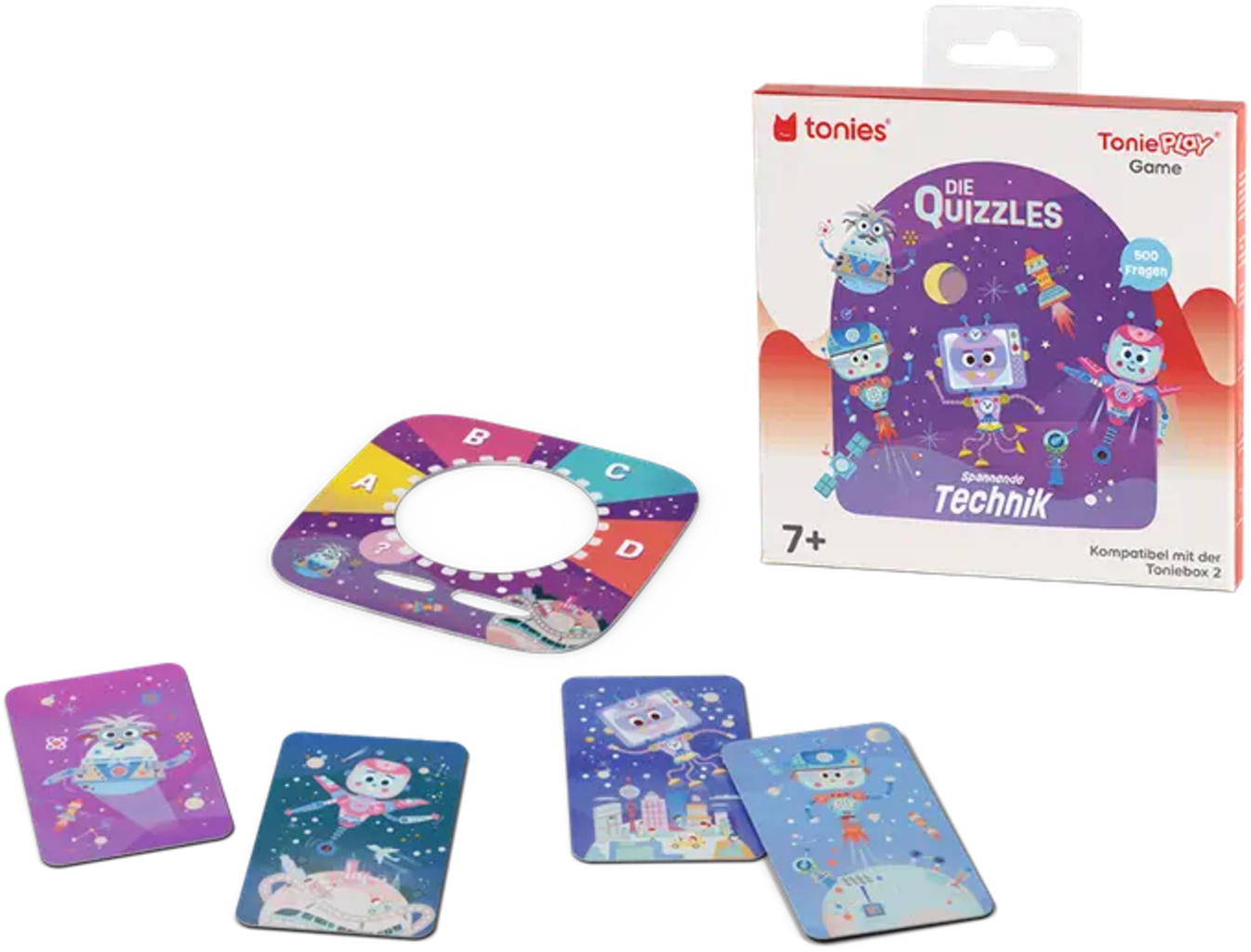 Alarm in het Quizzle-universum! Een intergalactische black-out heeft alles lamgelegd en alleen de knapste koppen kunnen de stroom weer terugbrengen. De Tonieplay Game M technologiequiz is het begin van een opwindende missie voor kinderen vanaf zeven jaar. Het doel is om 500 lastige vragen uit de wereld van de technologie onder de knie te krijgen: van beroemde uitvindingen tot snelle voertuigen en alledaagse voorwerpen, de kennis wordt op de proef gesteld. Deze spannende audioquiz zonder scherm stimuleert technisch inzicht en concentratie op een leuke manier. Wie genoeg energie heeft verzameld, neemt het in het ultieme duel op tegen de hoofdquizzer Quentin Quizzle. Alleen degenen die hem verslaan, krijgen de kroon en de titel van "Slimste kind in het universum"!