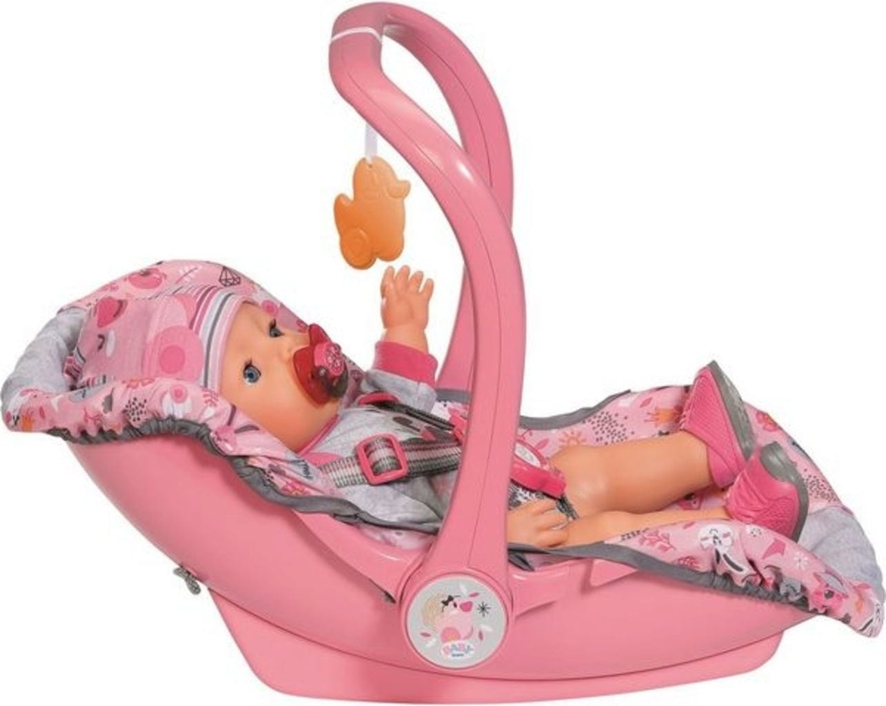 Voor bezoekjes aan vrienden of korte winkeltripjes - het BABY born draagstoeltje komt altijd van pas. Hij is bijzonder licht, zodat poppenouders hem zonder veel moeite kunnen dragen. De baby zit veilig in het draagstoeltje dankzij de veiligheidsriem. De eendenhanger Berta zorgt voor vermaak. Het draagstoeltje kan ook op de grond worden geplaatst en gebruikt worden als wiegje.